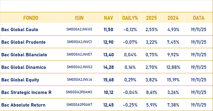 Vengono riportate di seguito le performance delle linee di investimento BAC Investments SG S.p.A.